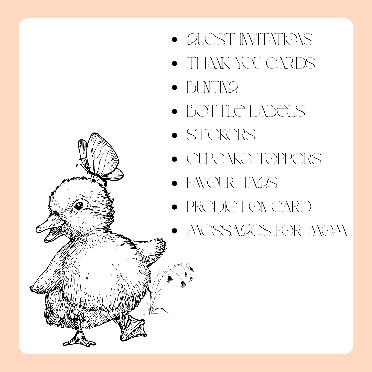 Save hours of planning with this elegant Baby shower bundle to download instantly. It features a delicate, neutral-toned Duckling theme, perfect for creating a warm and inviting celebration. Designed with soft neutral colours, this bundle is ideal for both girls and boys, or for gender-neutral showers.