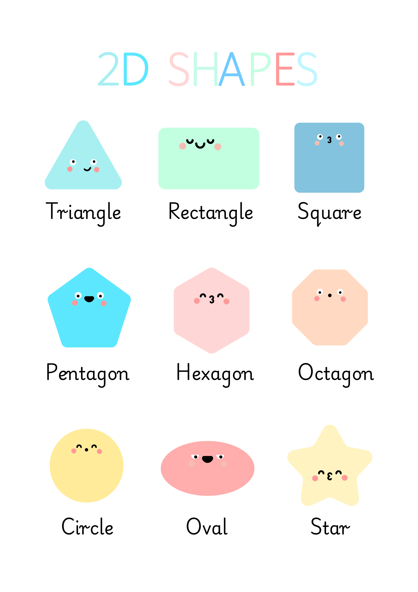 - 2D Shapes- Includes cute, friendly shapes like triangle, rectangle, square, pentagon, hexagon, octagon, circle, oval and star to support shape recognition.